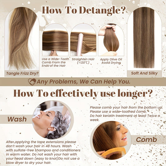 A professional remover—often an alcohol or citrus based formula—breaks the adhesive so tabs slide apart with gentle pressure. Do not yank; let remover work, then peel slowly and clean residue before reapplying fresh tape. Comb out the natural hair between tabs to remove shed hairs that collected during wear. Clarify, dry fully, and reinstall with new adhesive strips. Retape cycles commonly run six to eight weeks depending on growth, climate, and routine.