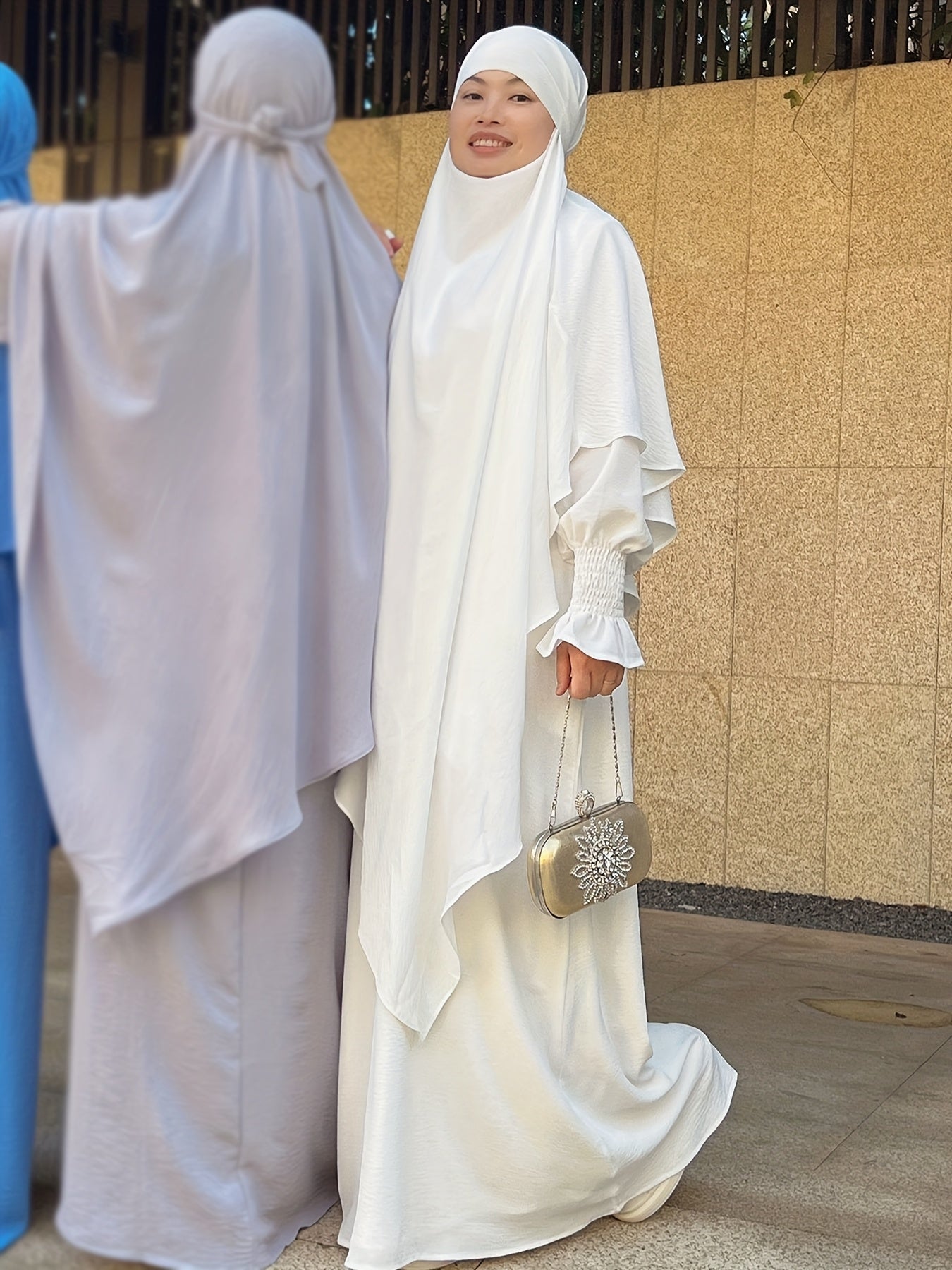 Styling an abaya and khimar is often approached as a question of occasion, but in reality, these garments are remarkably versatile. The Khimar + Abaya 2pcs Set is designed to be equally at home in sacred rituals and in the rhythms of everyday life. For Umrah and prayer, the ensemble provides the coverage, comfort, and dignity necessary for spiritual focus. The generous drape ensures no distraction, while the refined tailoring prevents the garment from feeling cumbersome. In this setting, the attire is not merely worn but lived—it becomes part of the sacred atmosphere itself.
