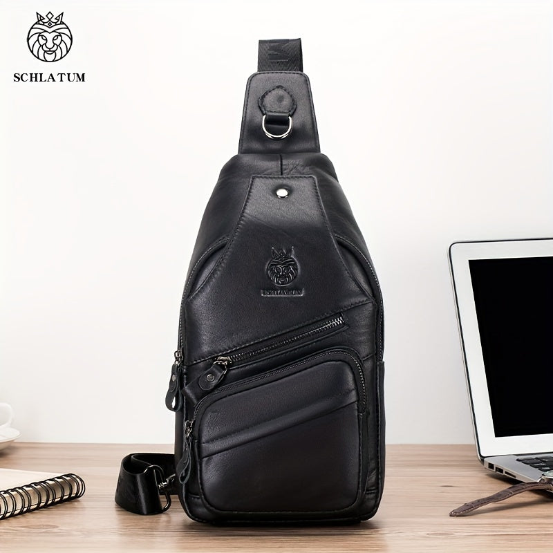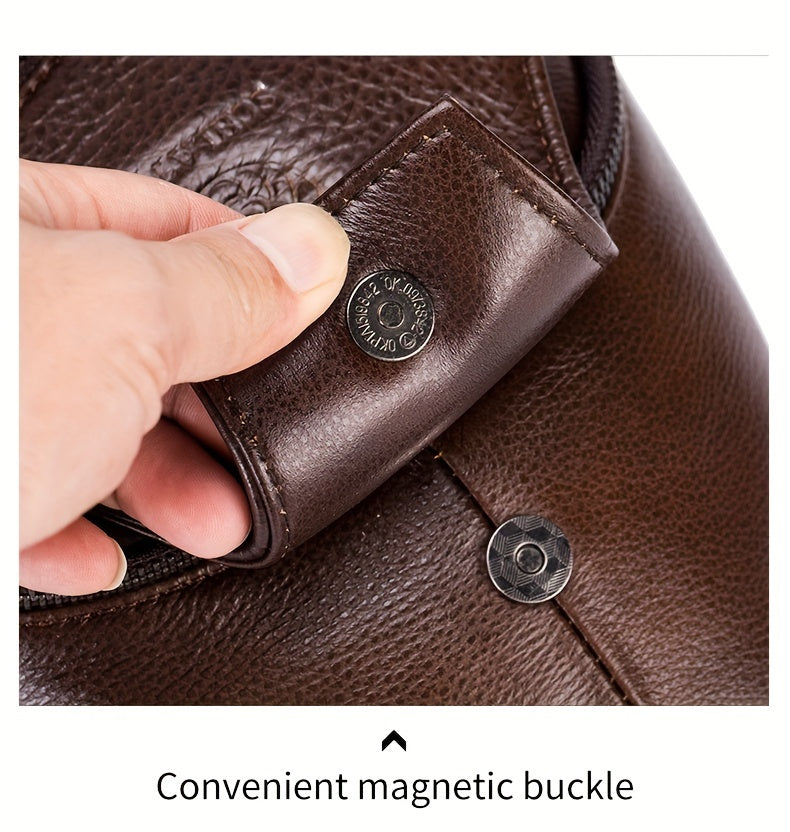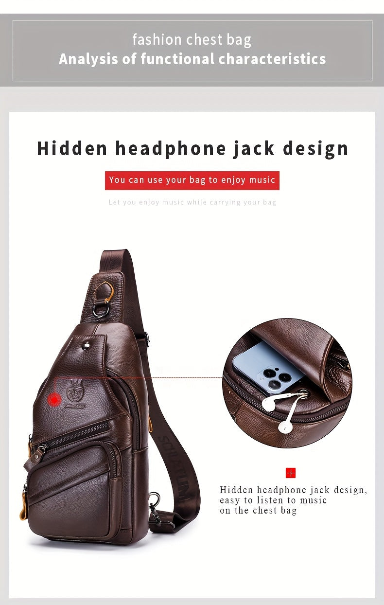 Men's Top Layer Cowhide Chest Bag, Genuine Leather Crossbody Bag, Retro Fashion Commuter Bag Multi-functional Travel Slant Shoulder Bag