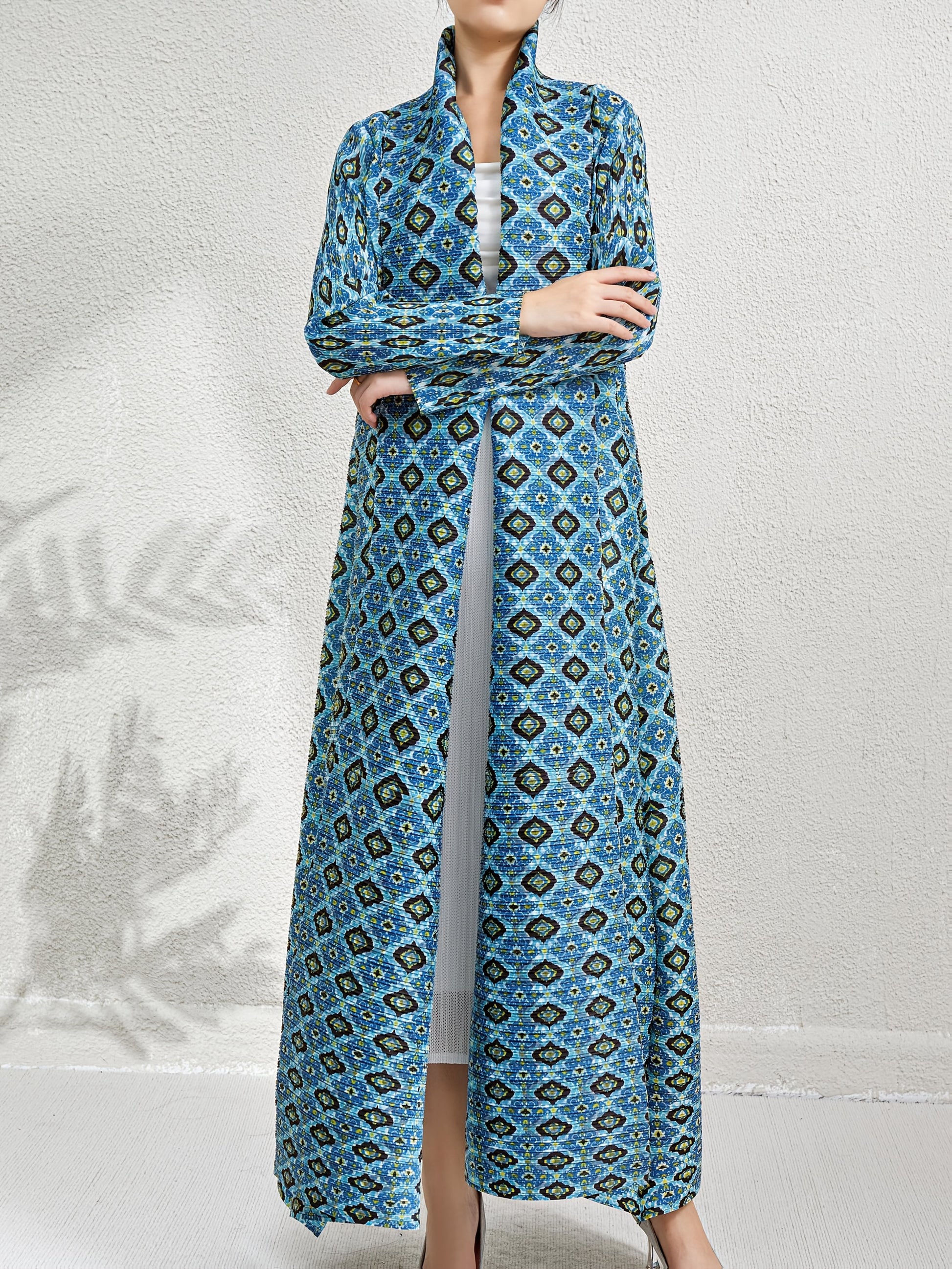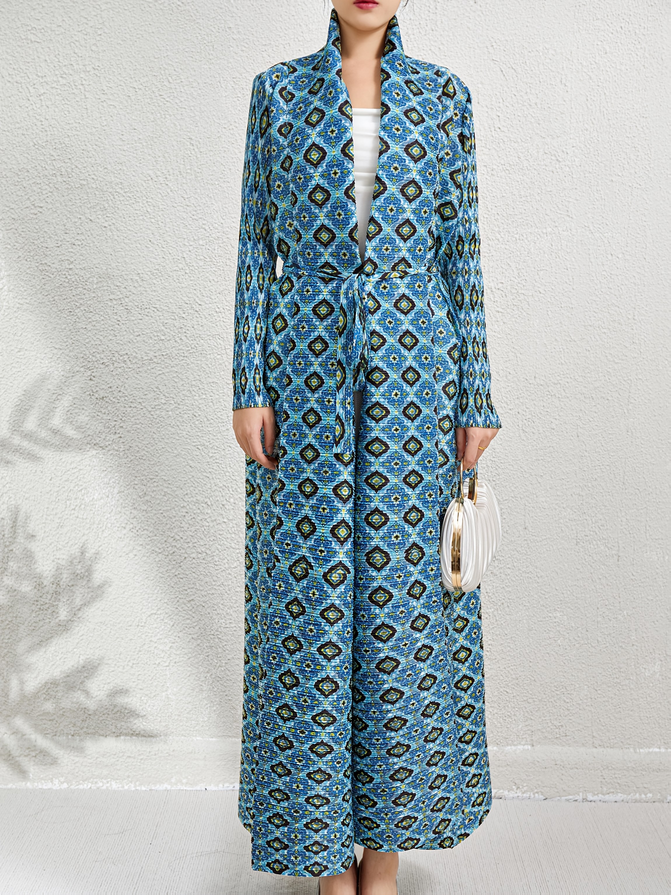2025 New Arrival - Loose Fit, Long Sleeve Abaya for Muslim Women, Blue Geometric Print, Casual Style, High Stretch Fabric, Pleated Design, All-Season Wear, Casual Abaya | Geometric Print Abaya