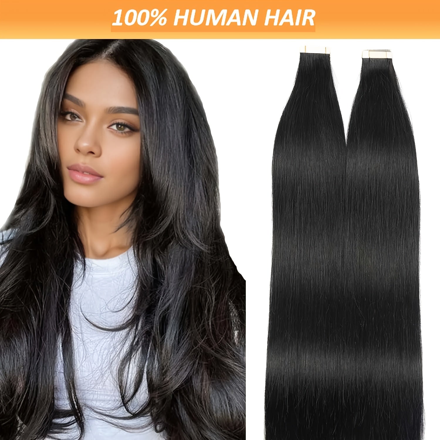 20pcs Tape-In Straight Human Hair Extensions 100% Remy Hair - Seamless Invisible Light Beige Weft, Natural Black #1B 16-26 Inch for Women, All Ethnicities