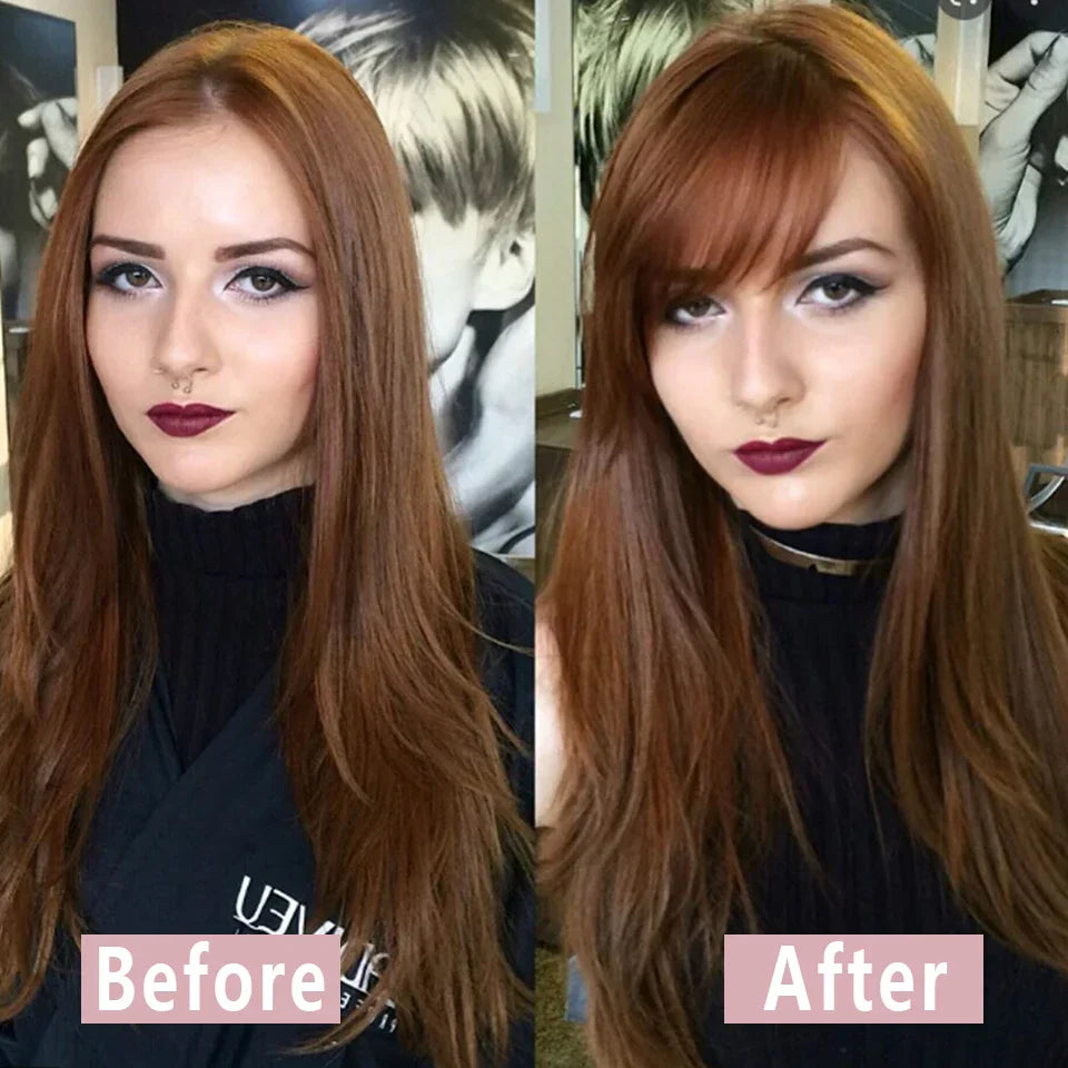 Made from high-temperature fiber, these extensions are not only durable but also versatile, allowing you to style them as you please. Whether you're opting for sleek sophistication or tousled charm, these extensions can handle it all. With a gradient bang design, they add depth and dimension to your hairstyle, effortlessly enhancing your look. Transform your tresses in minutes with our easy-to-use clip-in extensions. Plus, with our pure dark brown color, achieving that coveted shade has never been easier.