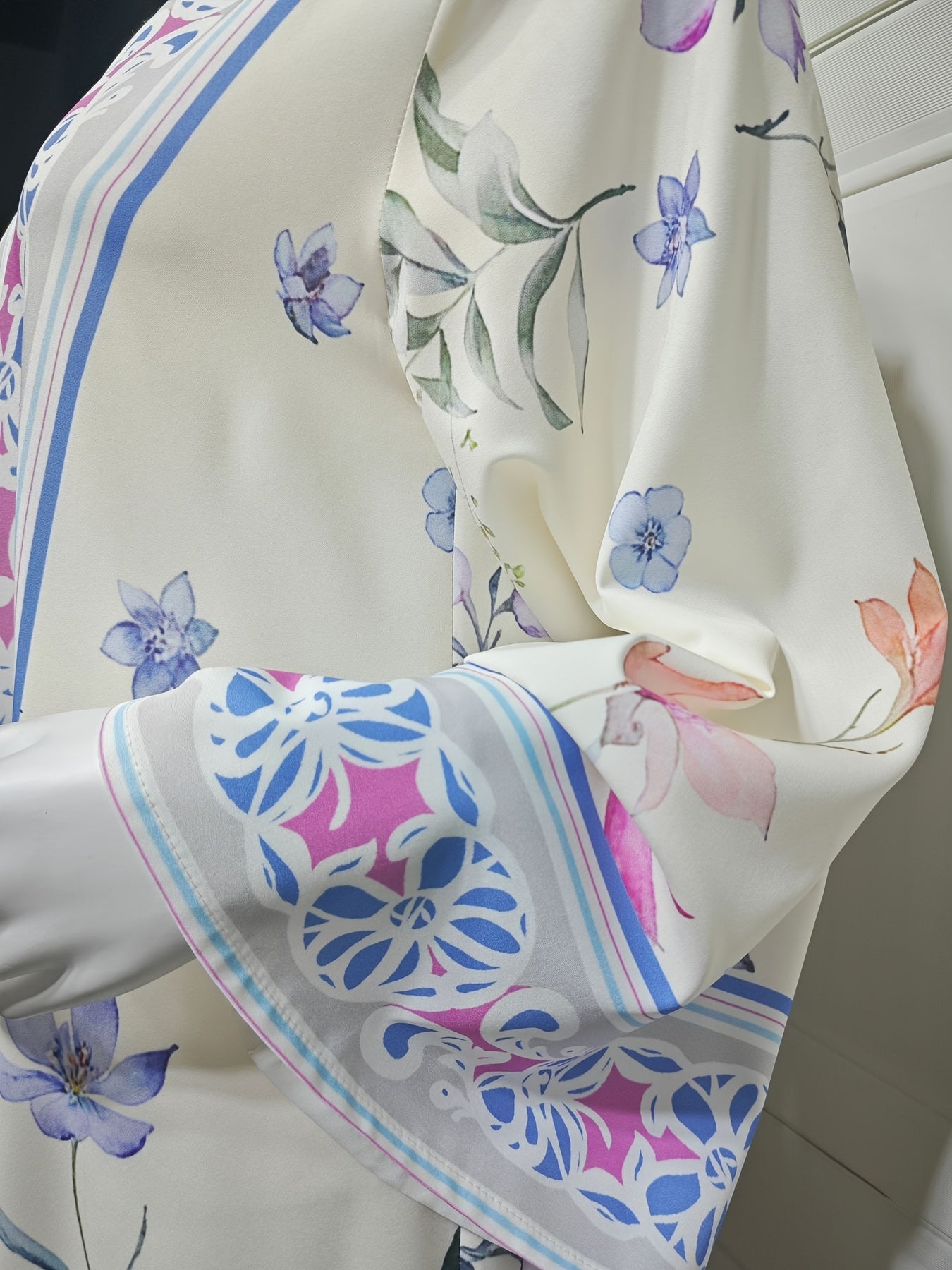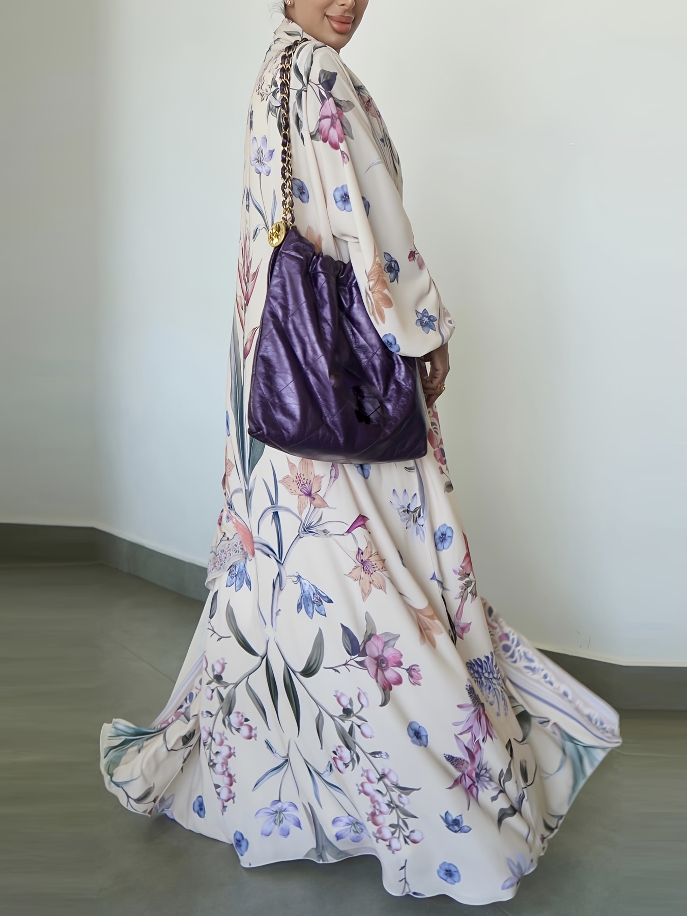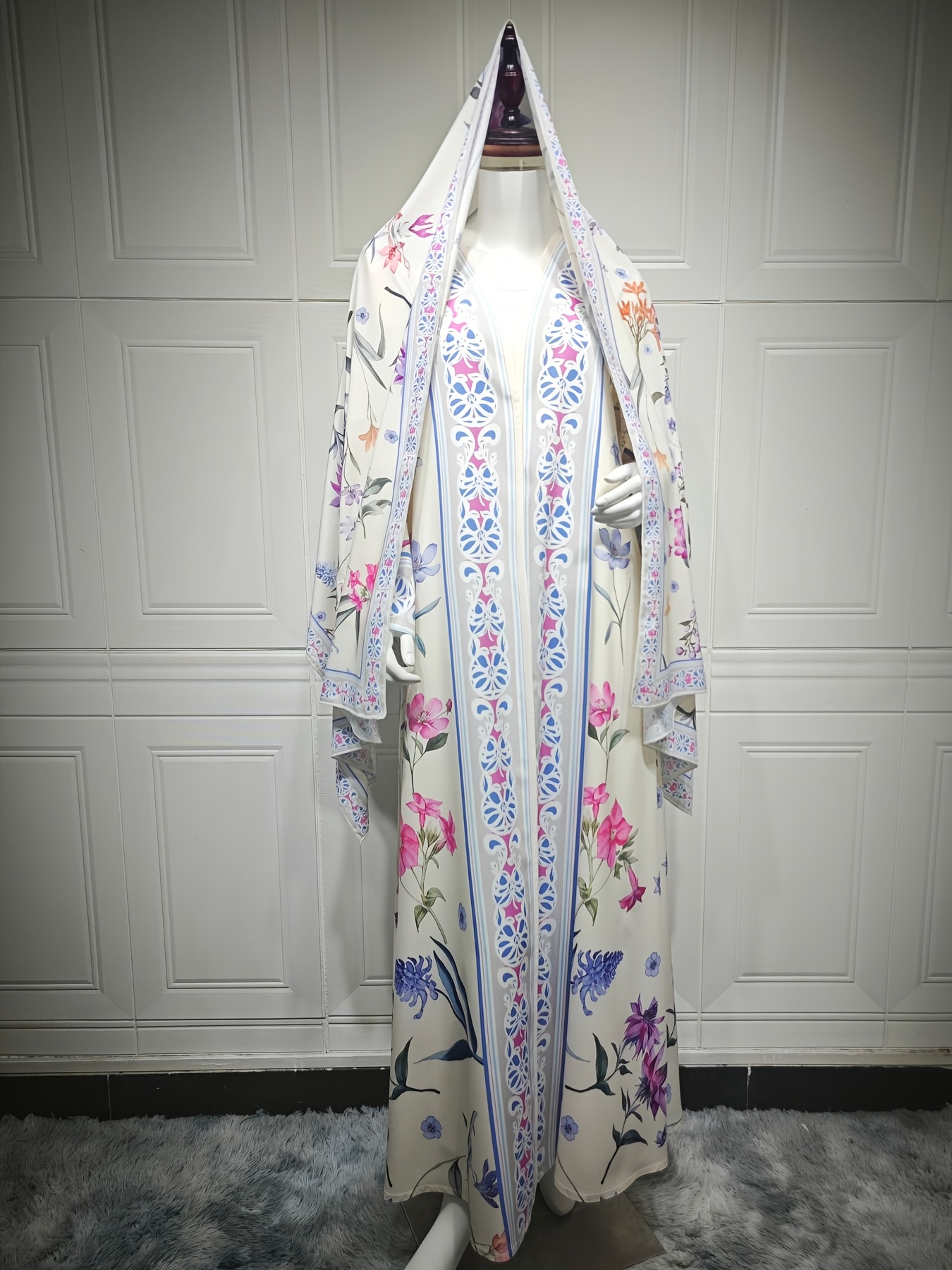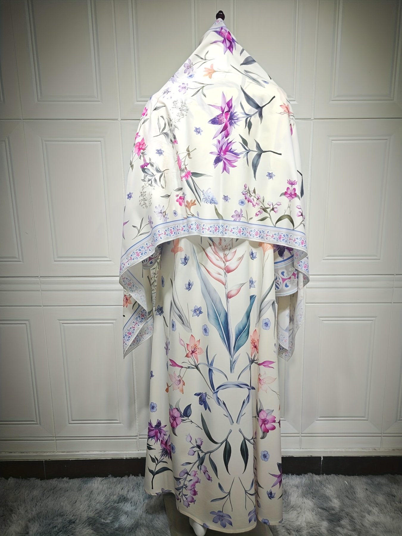 Floral Print V-Neck Abaya Robe with Long Sleeves - Lightweight Loose Fit Long Dress and Headscarf Set for Women, Spring/Summer Collection, Versatile Fashionable Long Robe, Headscarf 2pcs