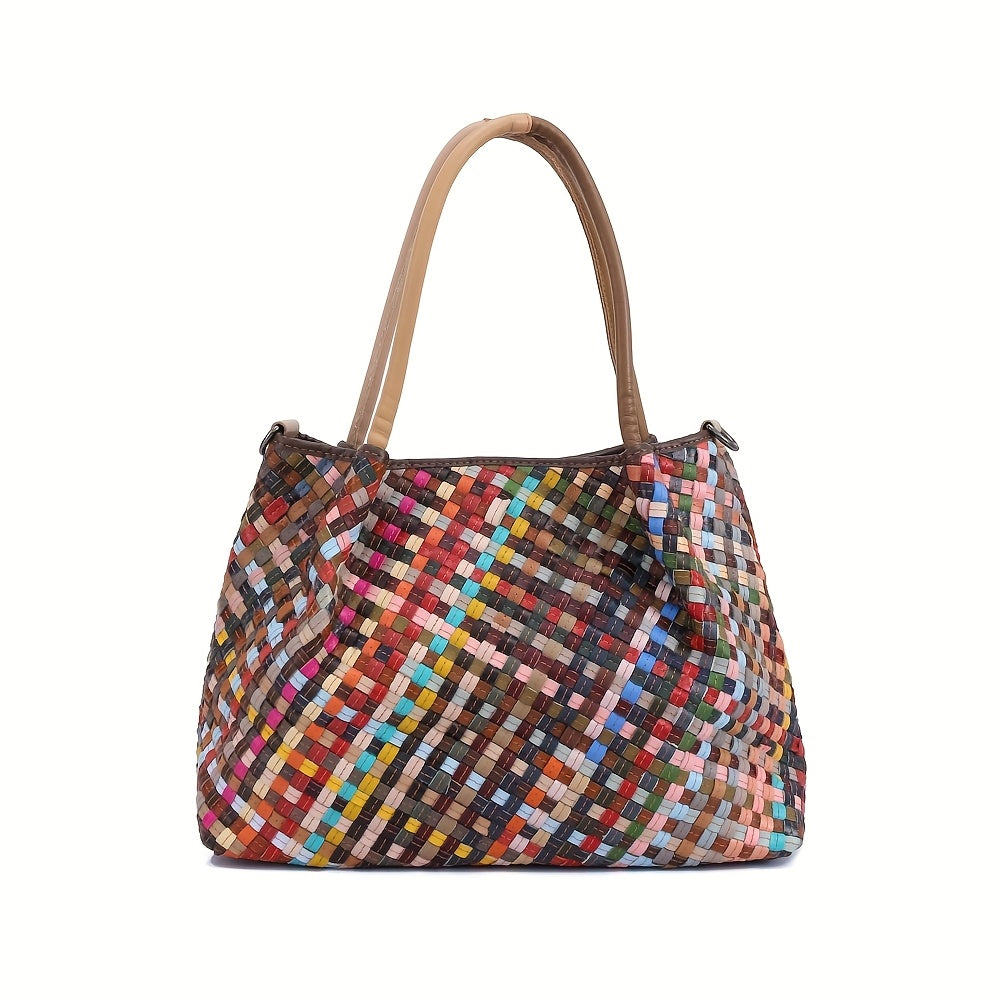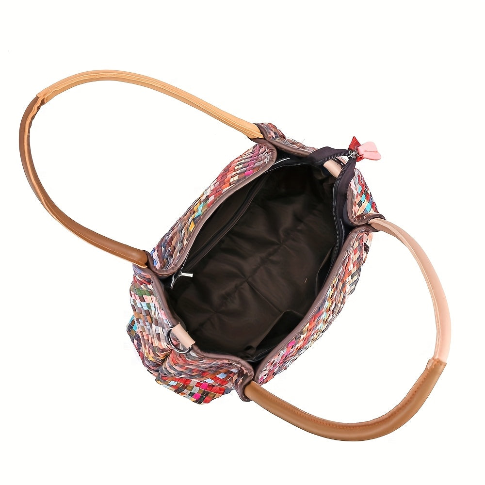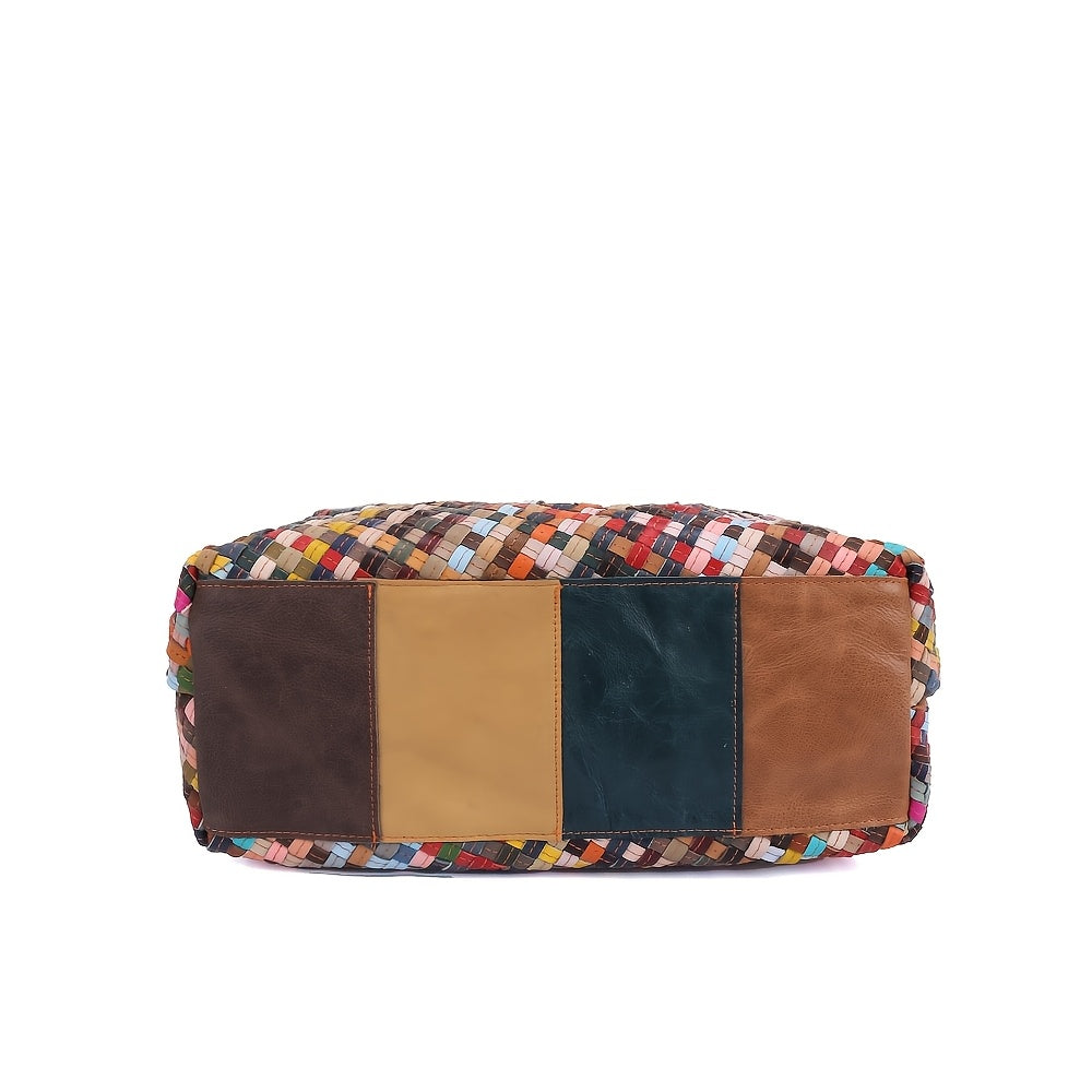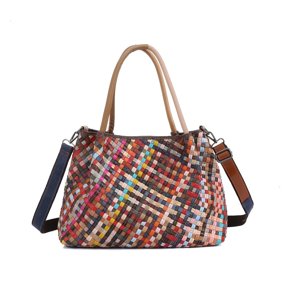 Genuine Leather Woven Women's Handbag with Adjustable Crossbody Strap, Colorful Striped Design, White/Red/Black Options, Perfect for Casual or Formal Occasions