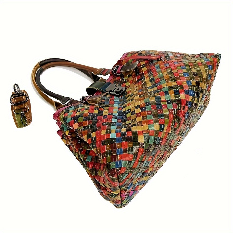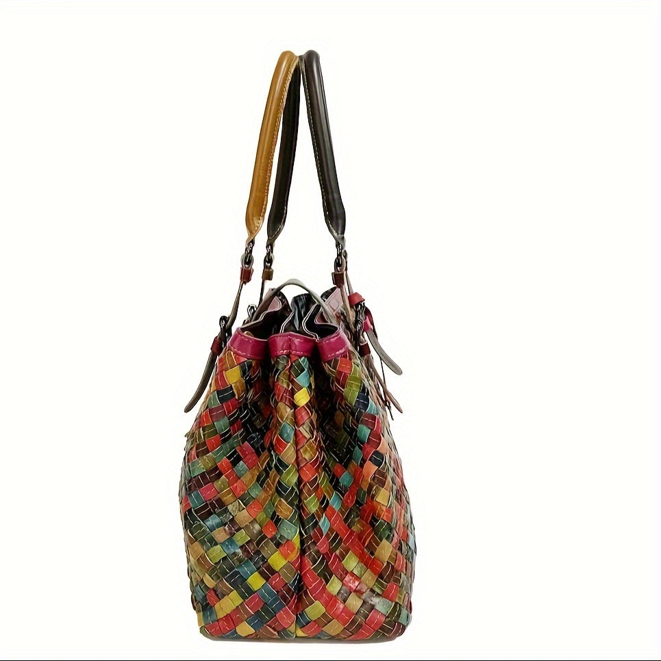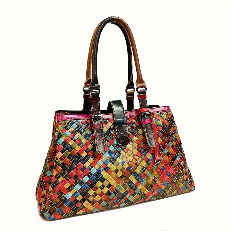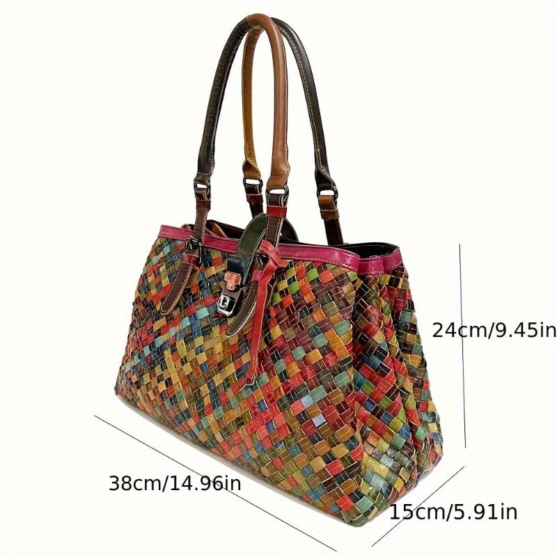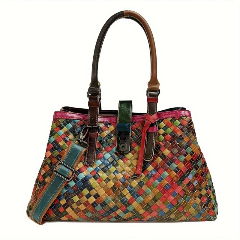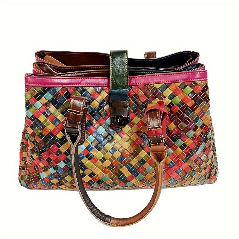 Ladies Colorful Woven Crossbody Bag, Ethnic Style Genuine Leather Women'S Bag, Cowhide Colored Retro Casual Women'S Single Shoulder Hand-Held Crossbody Bag