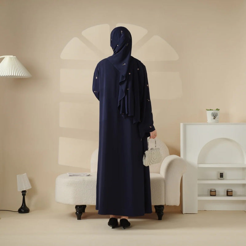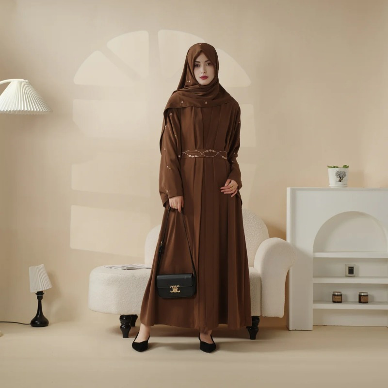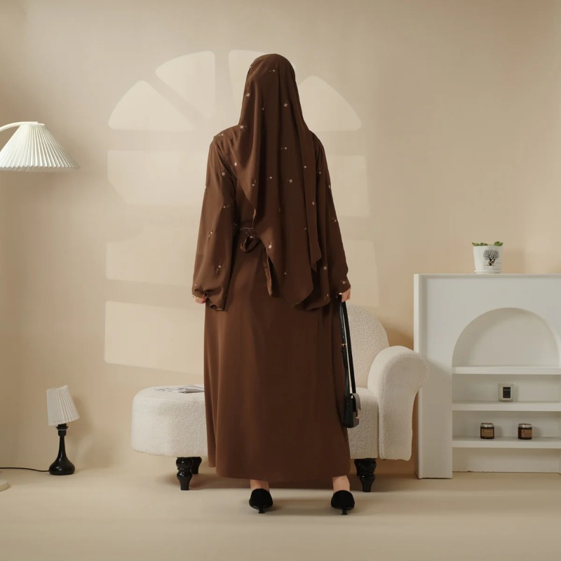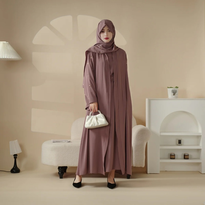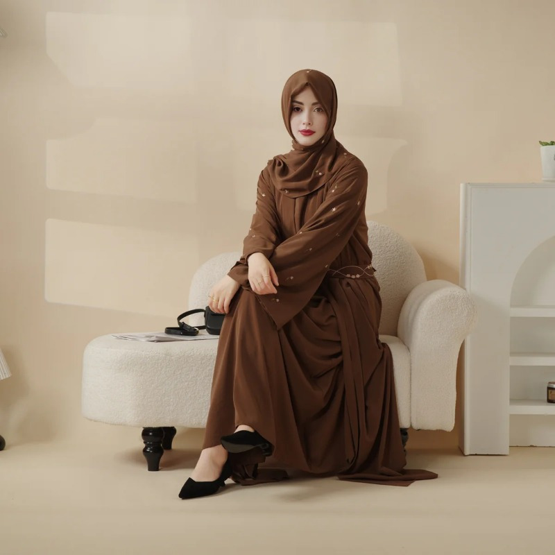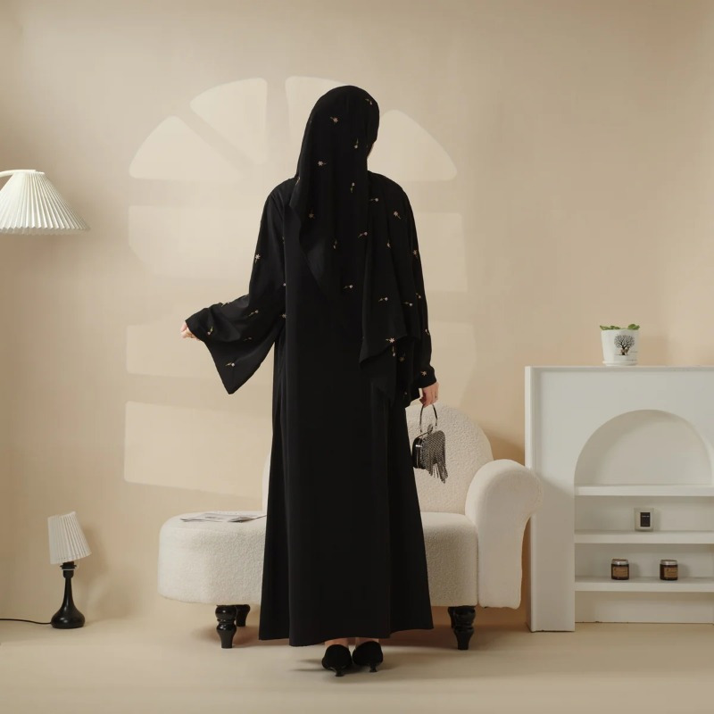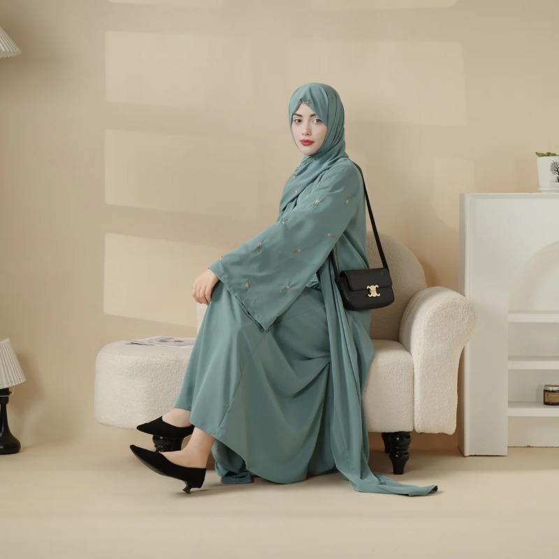 Tulip Embroidery Open Abaya 4pcs set: Includes open abaya, inner dress, matching belt, and hijab