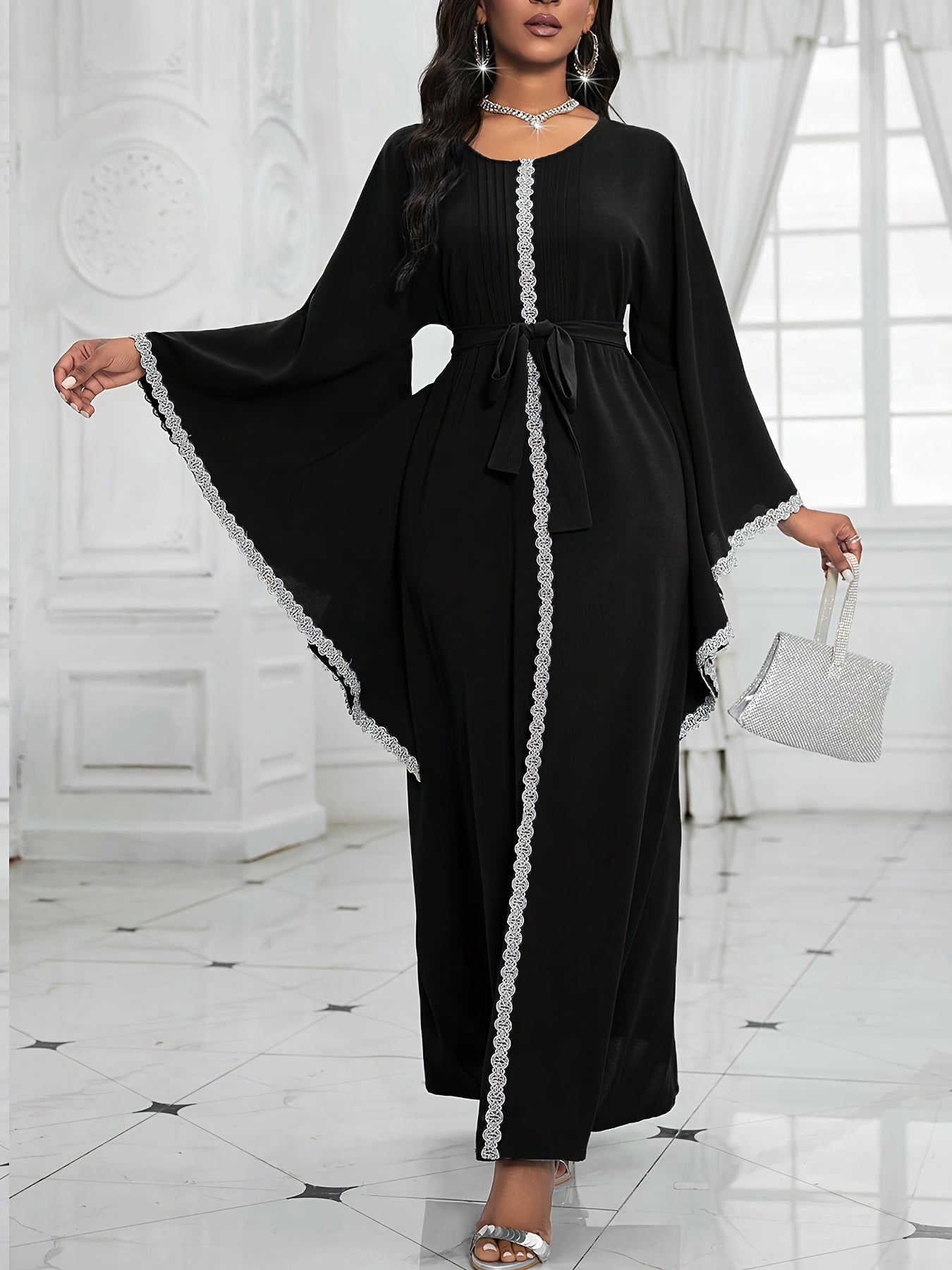 Women's Middle Eastern-Inspired Geometric Print Pakistani Abaya - Long Sleeve Belted Waist Floor-Length Dress with Pockets, Breathable Fabric for Spring/Summer