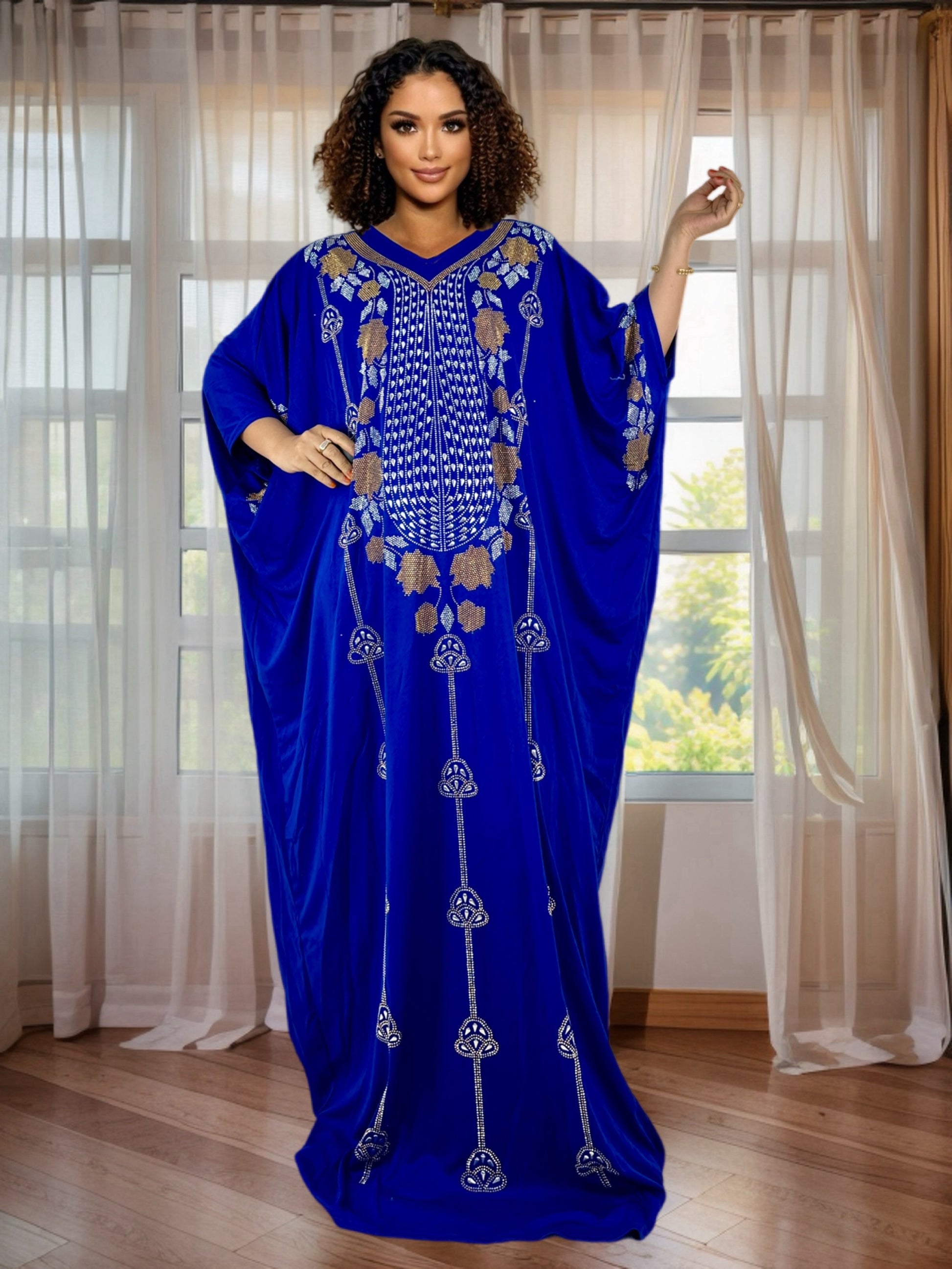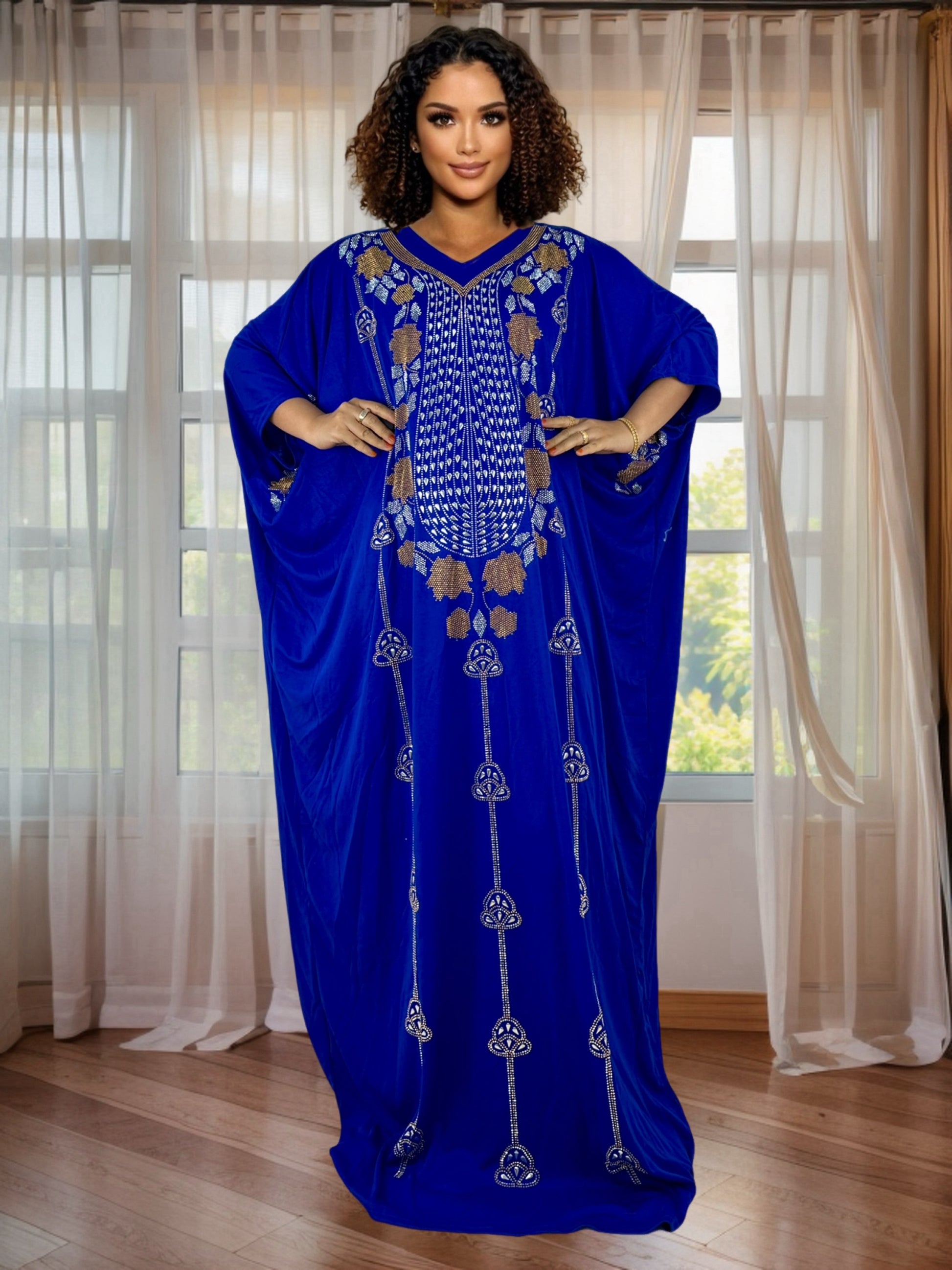 Women's Middle Eastern Turkish Kaftan Abaya - Royal Blue with Golden & White Embroidery, Long Sleeve Boho Elegance, Premium Fabric for All-Season Wear, Hand Wash/Dry Clean, Cultural Attire