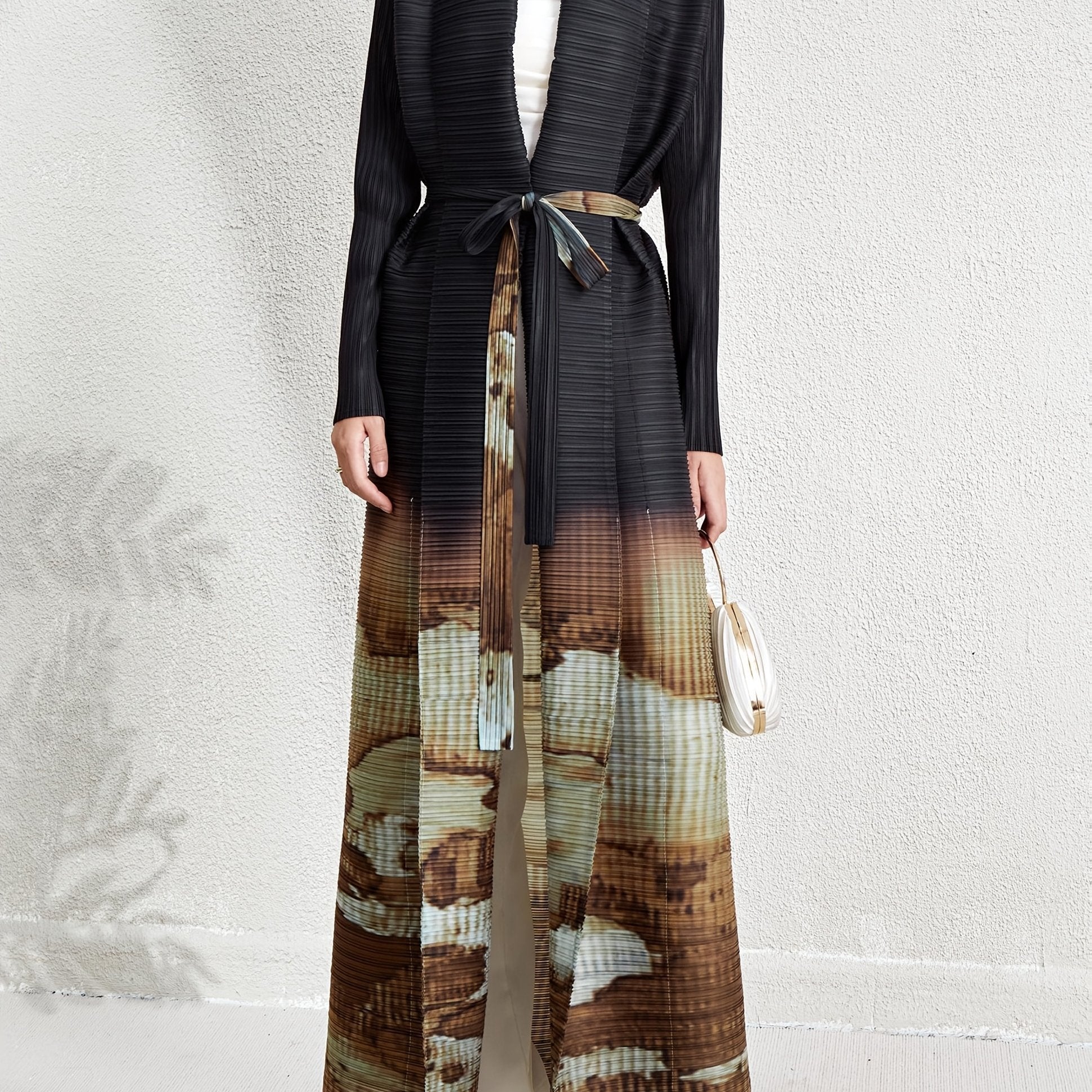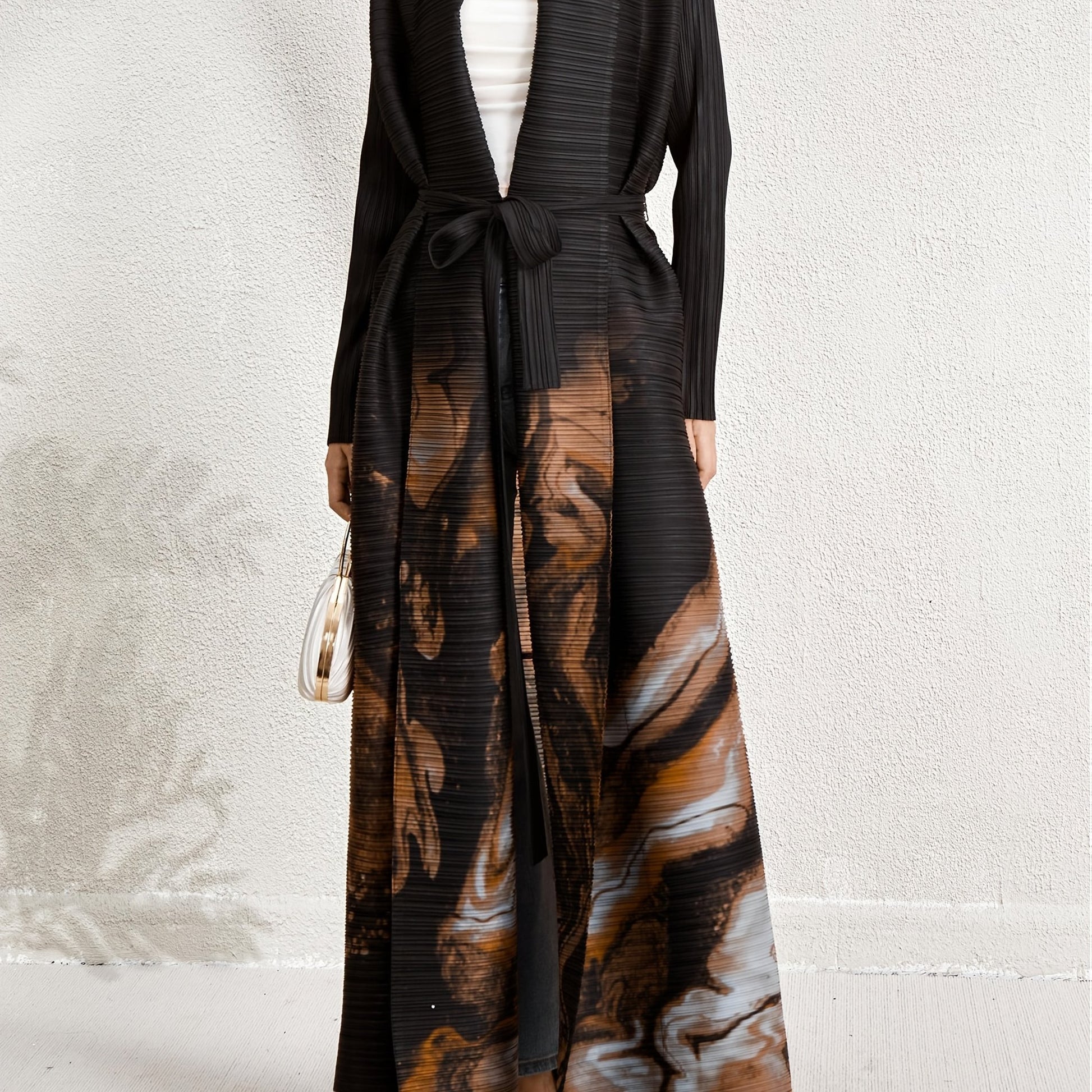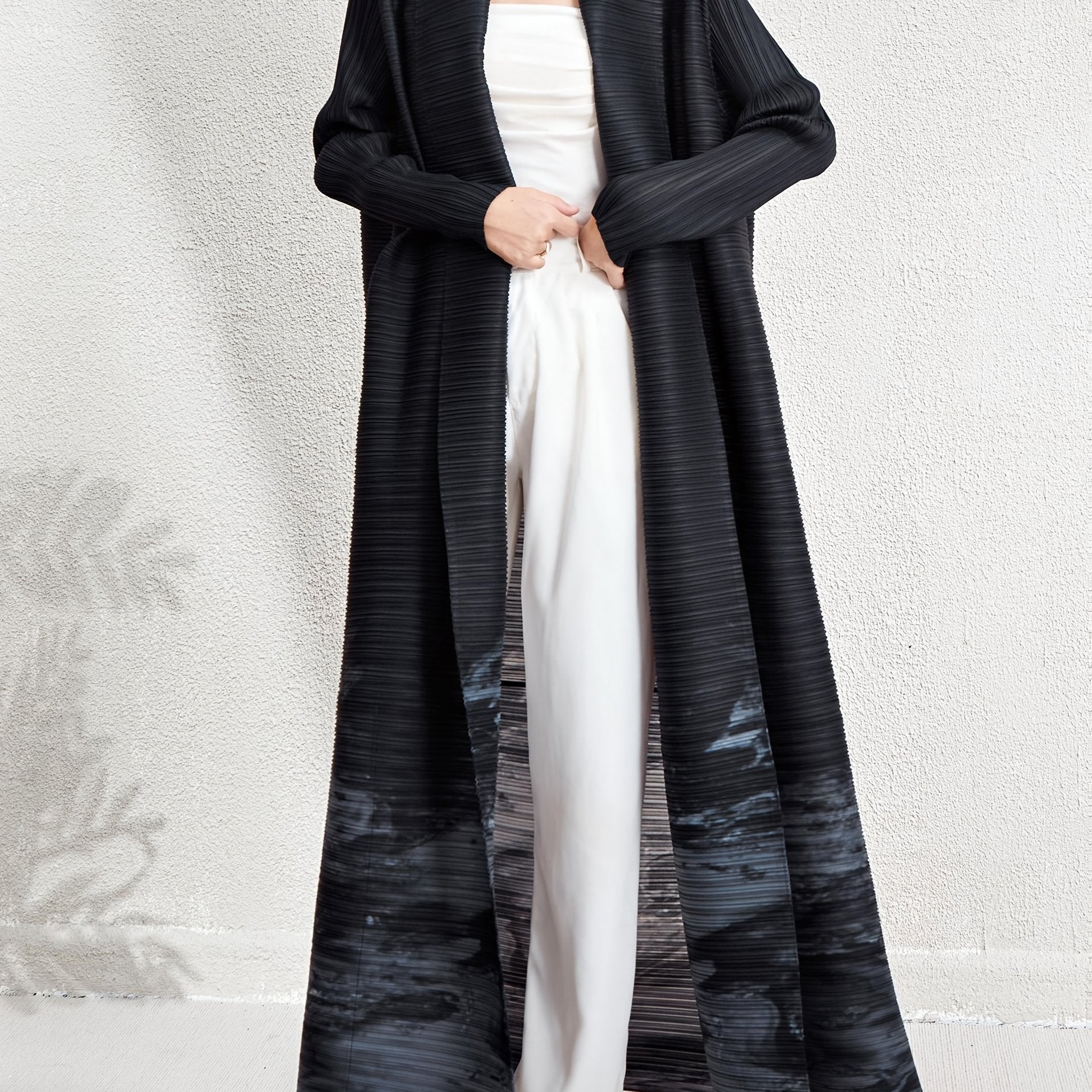 Women's Plus Size Geometric Print Long Sleeve Abaya Dress - Black & White Pleated Cardigan with Belt, Casual Loose-Fit Maxi Wrap for All Seasons