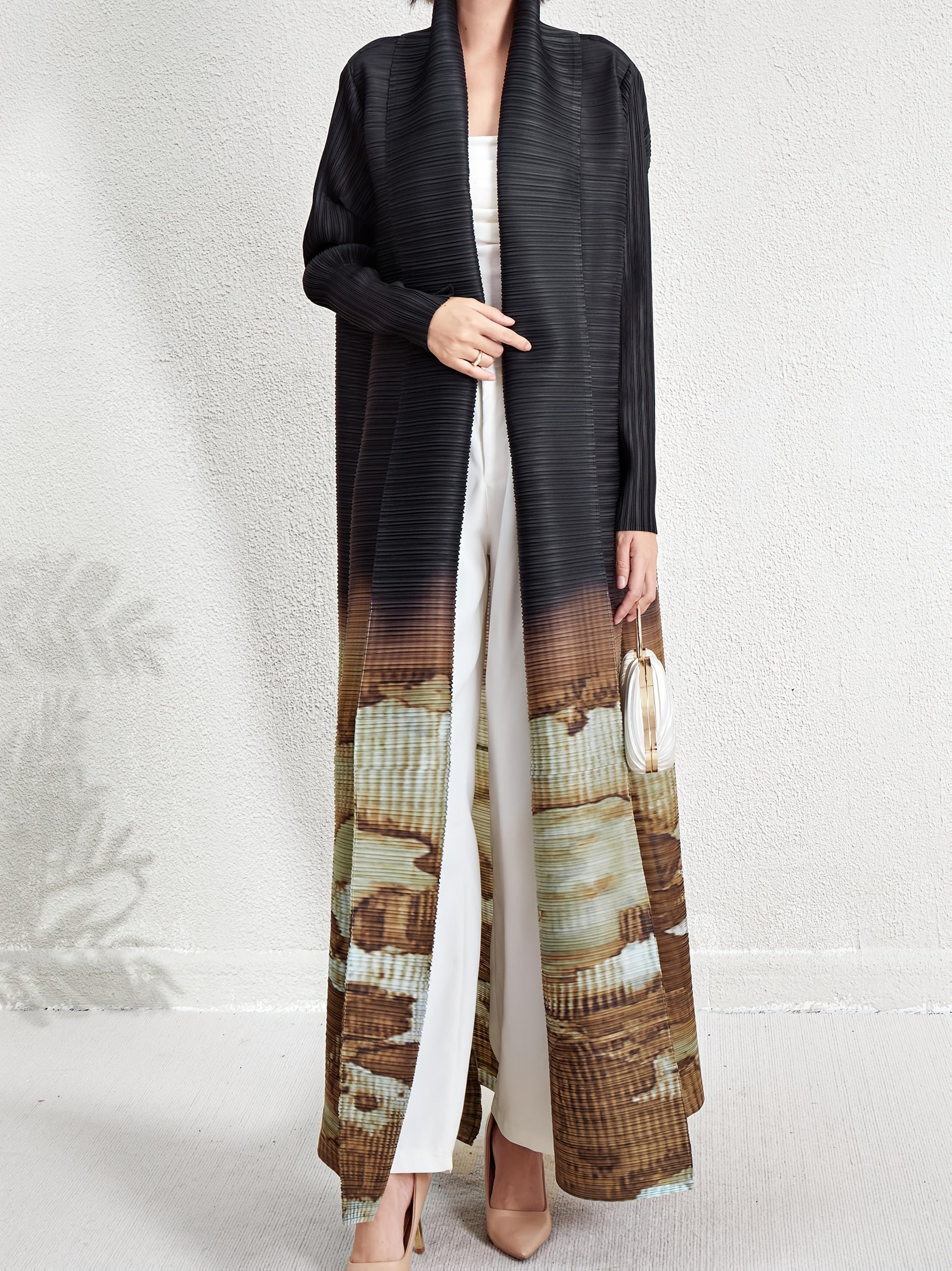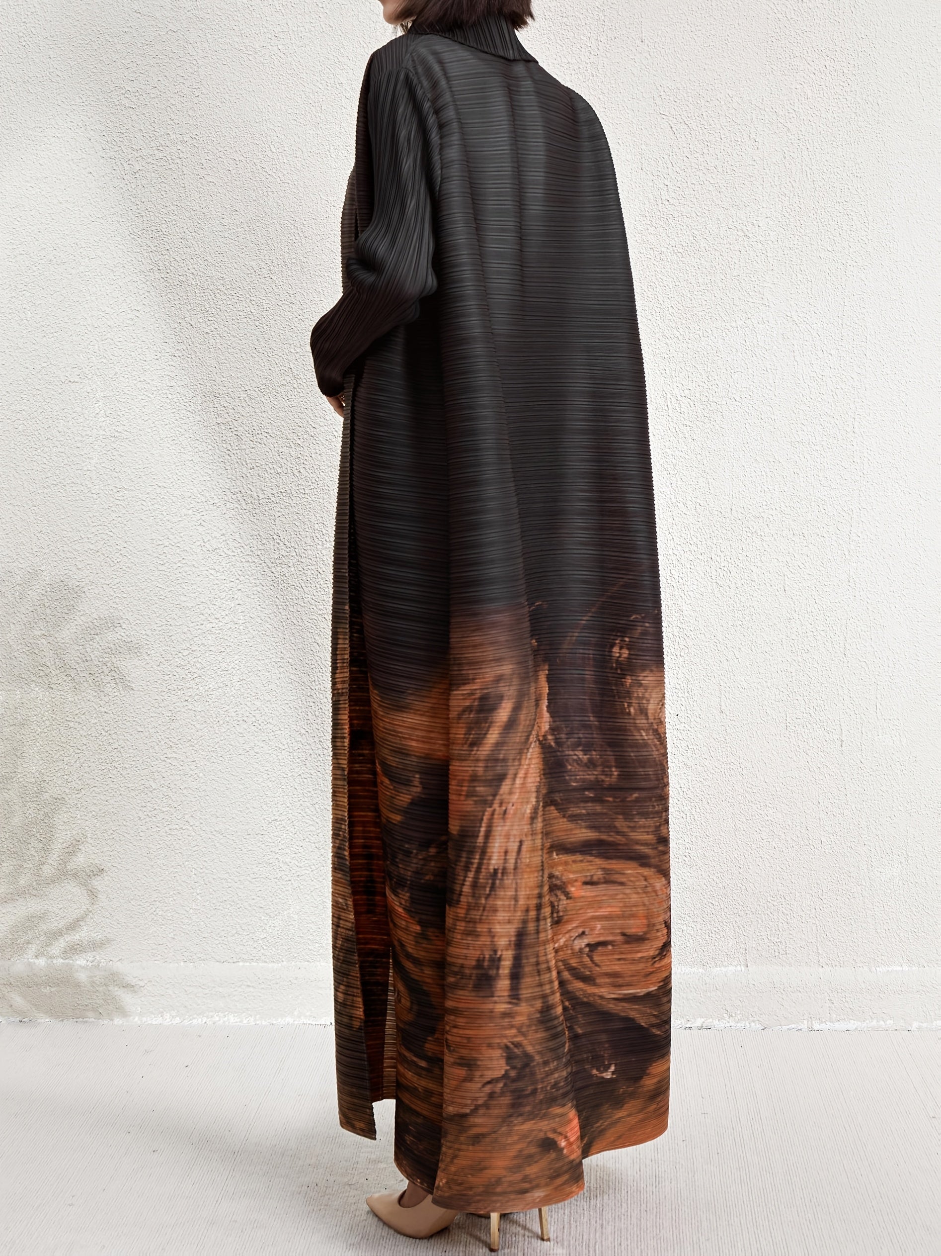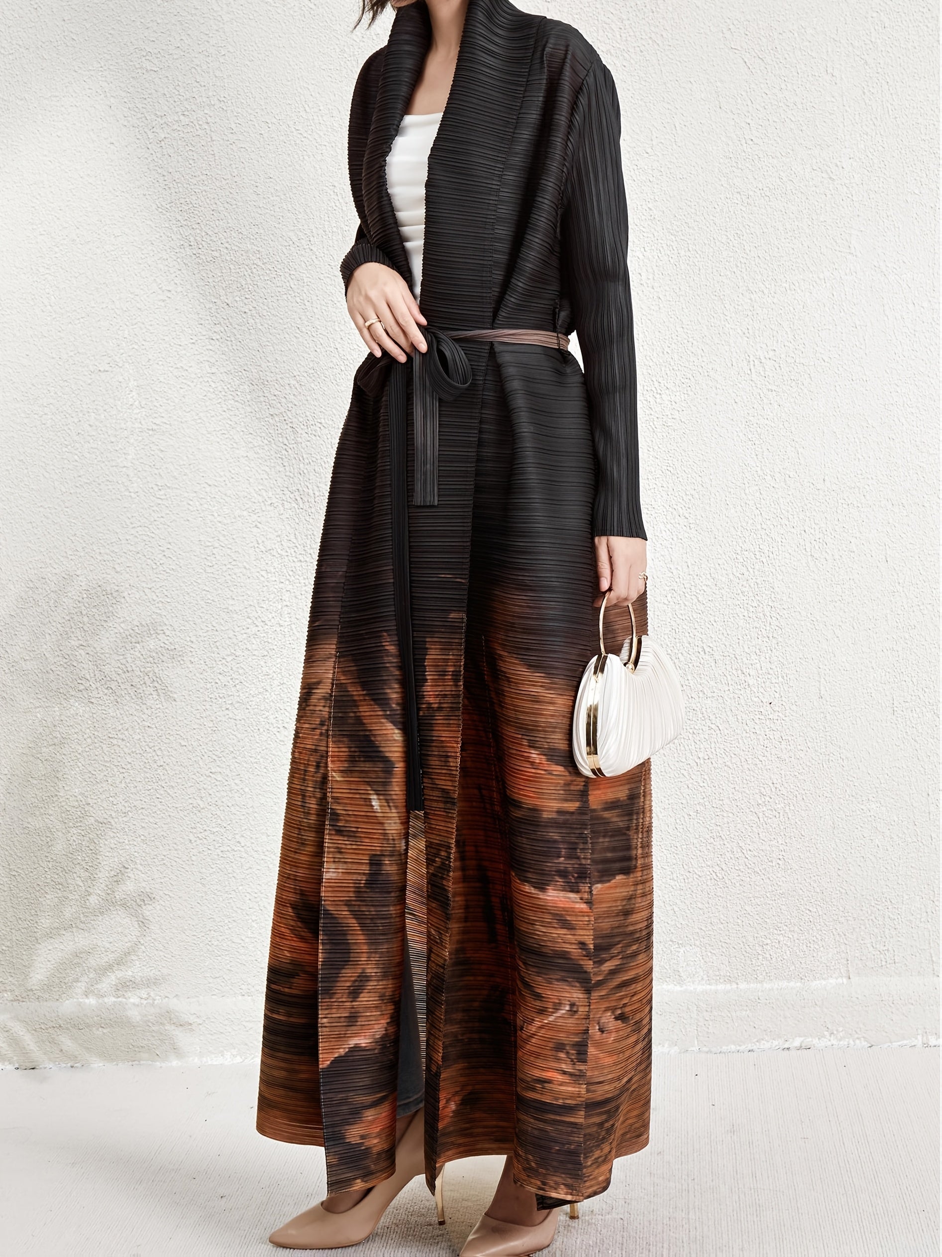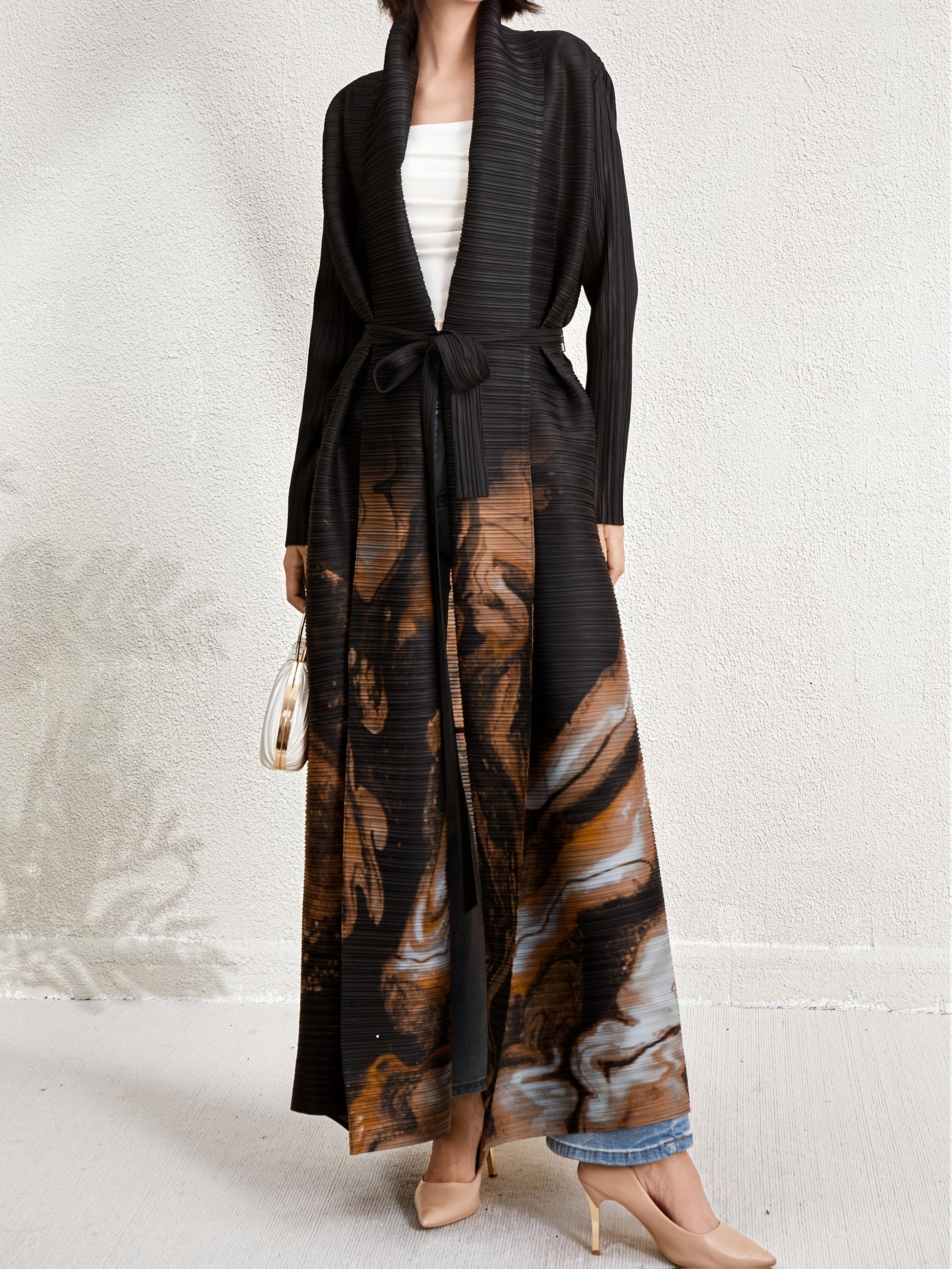 Women's Plus Size Geometric Print Long Sleeve Abaya Dress - Black & White Pleated Cardigan with Belt, Casual Loose-Fit Maxi Wrap for All Seasons
