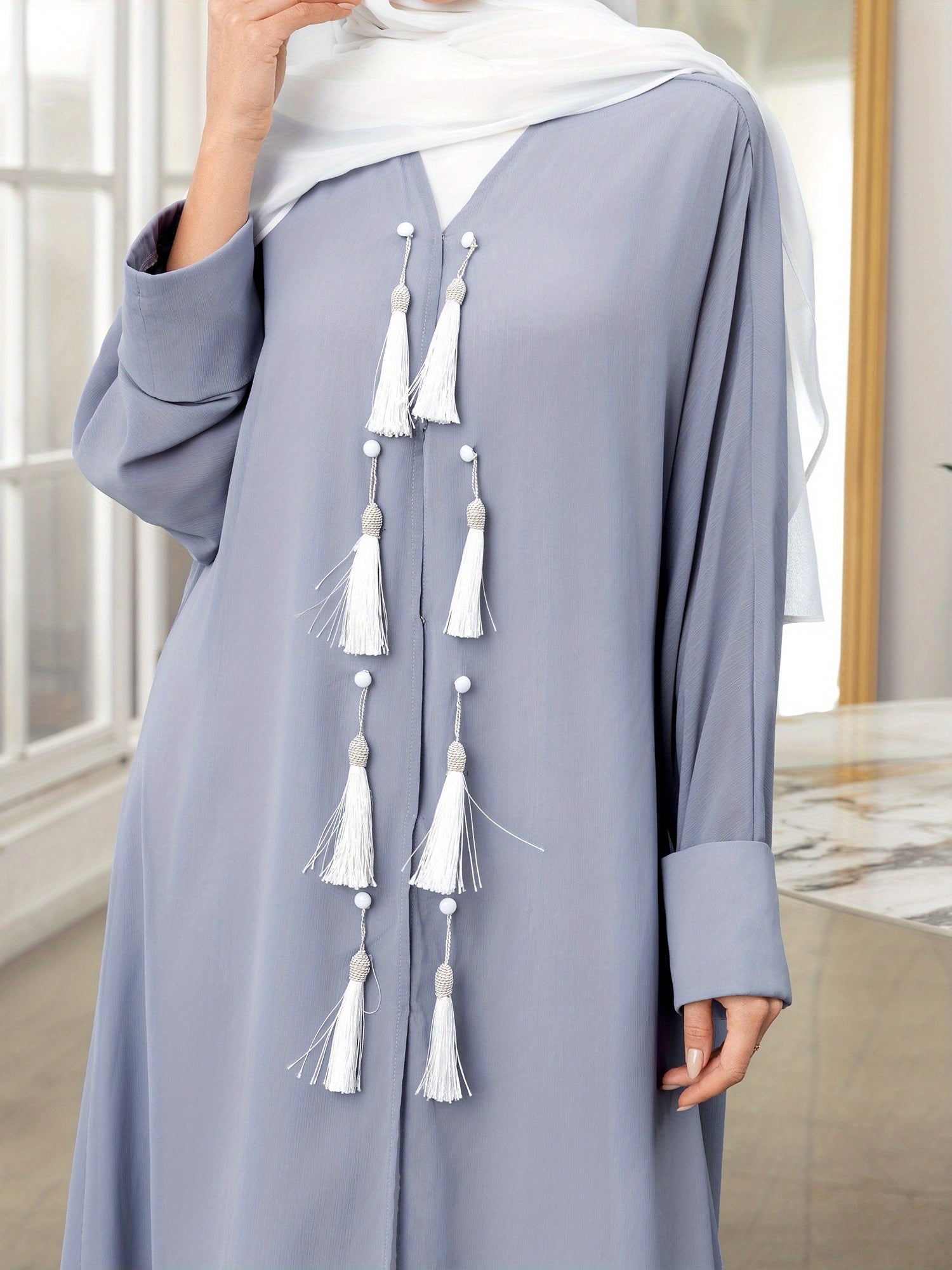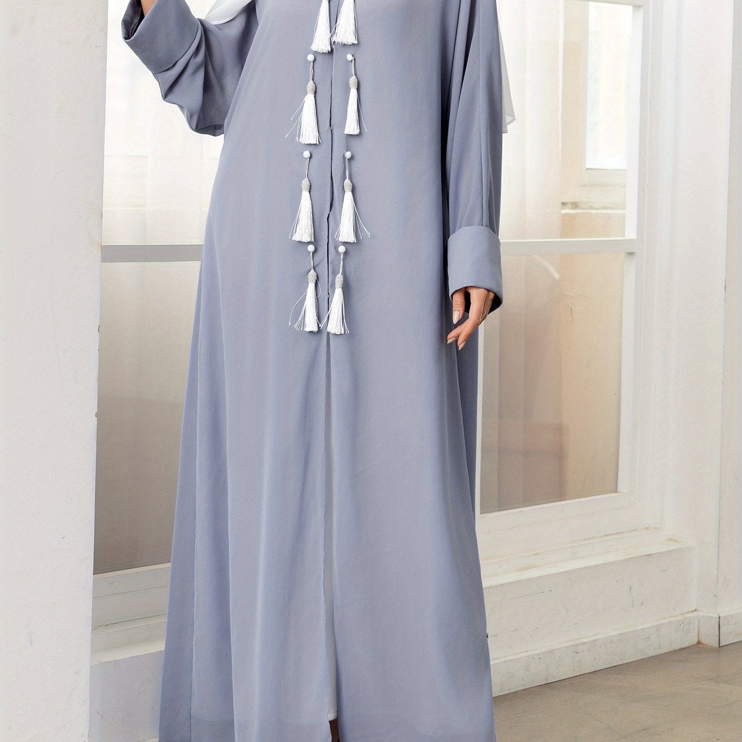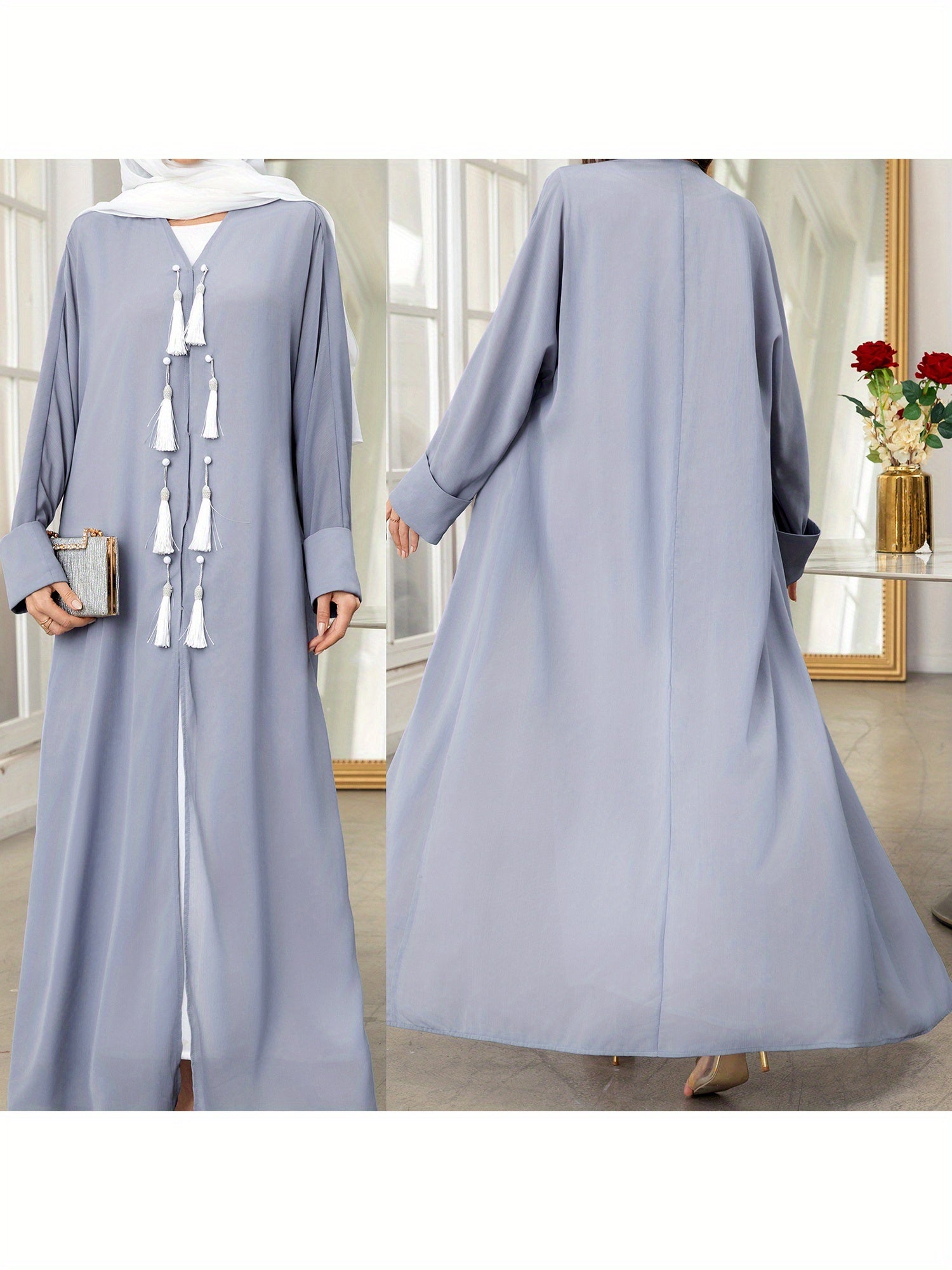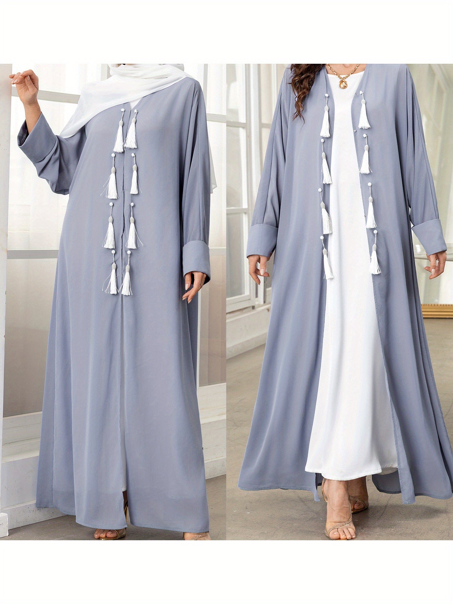 Women's Solid Color Long Sleeve Arabic Abaya - Loose Fit Tassel Trimmed Turkish Robe, Breathable Lightweight Machine Washable Spring Summer Casual Abaya Cardigan, Comfortable Clothing