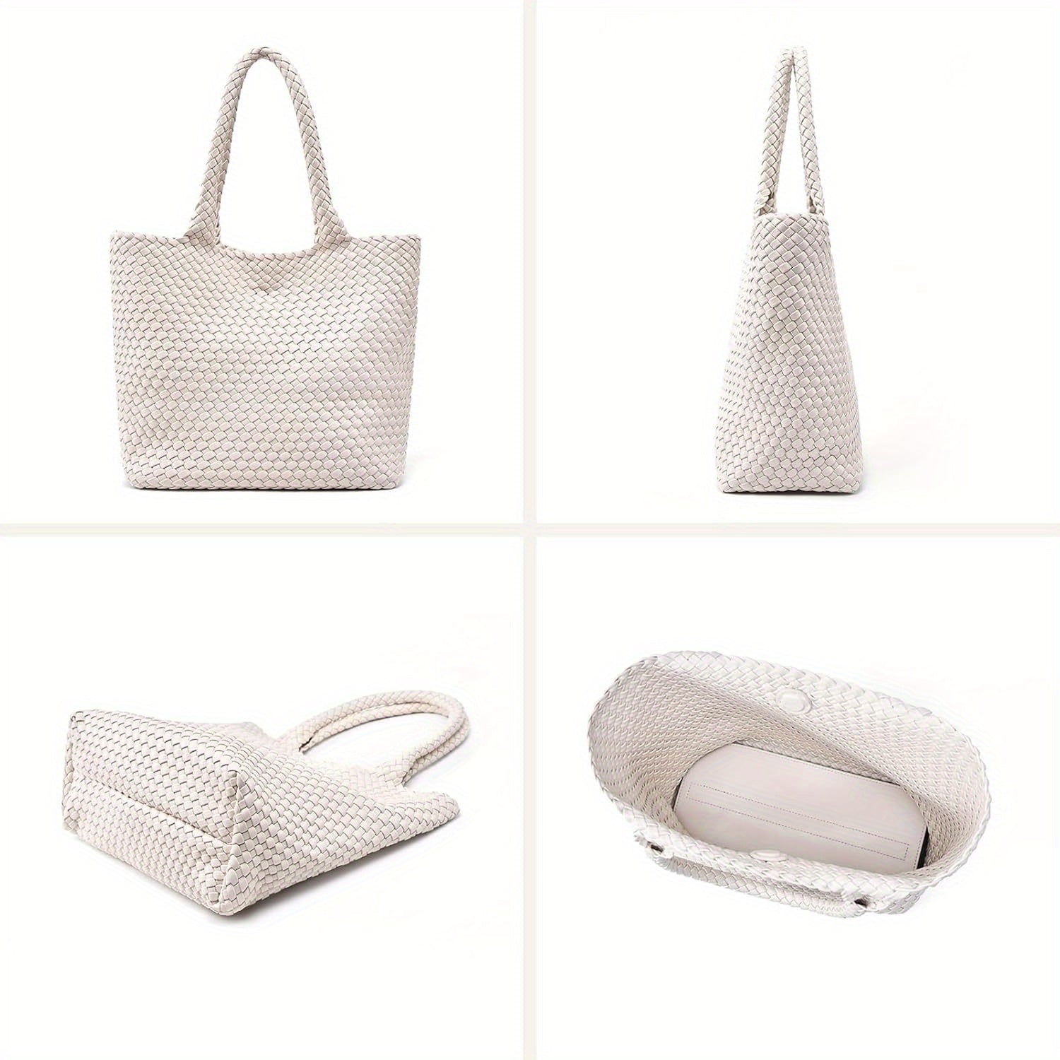 Women's Vegan Tote Bag - Large Woven Handbag with Zipper Closure & Wrist Strap, White & Brown Striped Design, Durable Oil-Edged Finish for Casual or Formal Use, Versatile Accessory, Minimalist Style, High-quality Craftsmanship